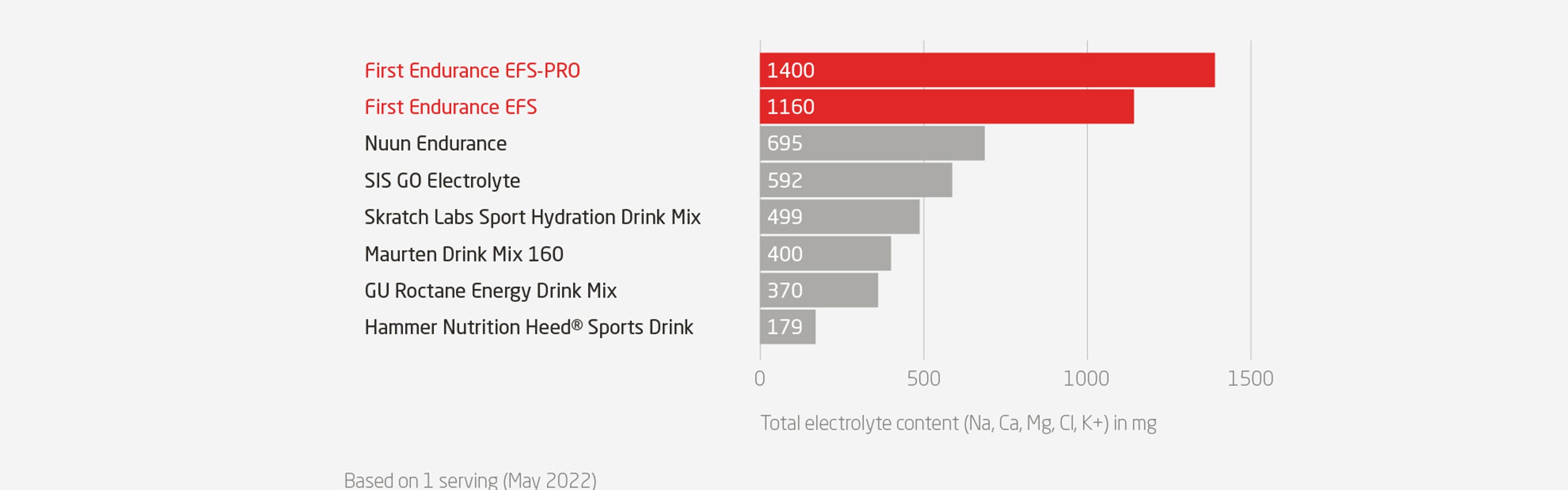 Unlike most hydration mixes, EFS delivers a clinically effective dose of all 5 electrolytes (sodium, potassium, chloride, calcium, magnesium) in the levels shown to prevent cramping.